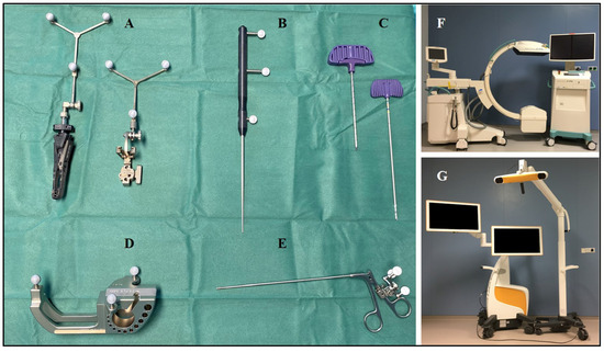 Intraoperative instruments and devices for navigated biopsies. (A) Reference basis frame (tracker). (B) Standard needle probe (pointer). (C) Bone-access instrument (KyphonTM Xpander II Osteo Introducer, size 3.8 ga access, Medtronic). (D) Calibration instrument. (E) Rongeur. (F) Three-dimensional flat panel C-arm (Ziehm Vision RFD). (G) Optoelectronic navigation system (Curve™ Image Guided Navigation, Brainlab).