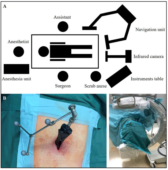 Intraoperative application and implementation of the navigation technique. (A) Set-up for the navigation, arrangement of persons, and positioning of the patient in the OR during navigation from a bird’s-eye view. (B) Attachment of the reference base by carbon clamp on the upper lumbar spine (L1) of a 54-year-old patient with a recurrence of chondrosarcoma at the level of the thoracic spine (Th 12). (C) Positioning of the C-arm and covering the patient.