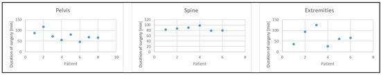 Learning curve for the duration of surgery [min] for the biopsy of tumors on the pelvis, spine, and extremities.