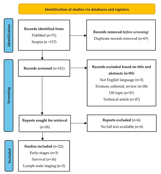 The literature search yielded 188 articles. After excluding duplicates (67) and gray literature, including erratum, editorials, and reviews (28), off-topic articles (37), technical articles (27), or articles not written in English (3), and after reviewing the abstracts of the remaining articles, 26 reports were retained. Of these, 22 met the inclusion criteria (Figure 1). The remaining four articles had no full text available.