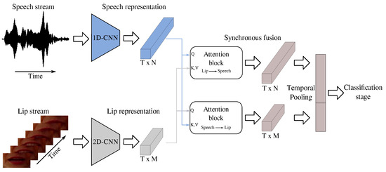 After obtaining each representation, we used the attention mechanism to synchronously combine the speech stream with the lip stream considering the temporal domain (see Figure 2). After obtaining this new representation containing both streams, we computed an average in the temporal dimension to obtain a static representation and proceed with the classification stage. In this work, we performed the speech-to-lip and lip-to-speech projections, and also both, after temporal pooling (speech-to-lip + lip-to-speech).
