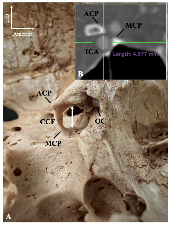 (A) The maximum transverse diameter (white arrow) of the caroticoclinoid foramen (CCF); (B) the internal carotid artery (ICA) diameter. ACP—anterior clinoid process; MCP—middle clinoid process; OC—optic canal.