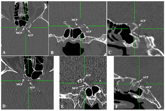 The presence of the caroticoclinoid bar (CCB) in computed tomography scans. (A–C) Axial, coronal, and sagittal reconstructions of a complete CCB. (D–F) Axial, coronal, and sagittal reconstructions of an incomplete CCB. ACP—anterior clinoid process; MCP—middle clinoid process.