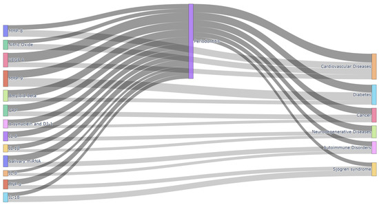 Diagram showing relationships between oral biomarkers, periodontitis, and systemic diseases. Source: Self-elaboration.