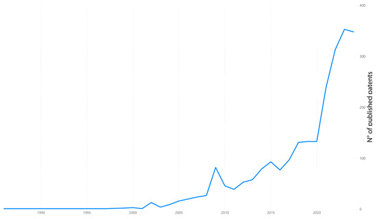 The evolution of the number of patents of oral biomarkers for the assessment of noncommunicable diseases by year. Source: data from Google Patents after searching for “oral biomarkers AND noncommunicable diseases” on 26 December 2024 (10,278 results). Source: Self-elaboration.