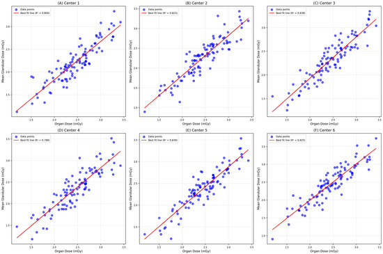 As part of the regular quality control (QC) procedures, the system-reported K_i values were verified against measurements taken with traceably calibrated instruments. This verification process ensures the accuracy of the dose calculations used in both system-reported organ doses (ODs) and manually calculated mean glandular doses (MGDs). The most recent QC results showed that the system-reported K_i values were within 5% of the measured values, which is within the acceptable tolerance of ±10% set by the American College of Radiology (ACR) and European Reference Organization for Quality Assured Breast Screening and Diagnostic Services (EUREF). Although we did not explicitly account for changes in breast tissue composition or operator procedures among clinics, we implemented various measures to mitigate their influence on our findings. The substantial sample size of 2754 patients aids in improving the impact of individual differences in breast tissue composition. Furthermore, all centers follow the standardized mammography protocol in accordance with international norms, hence minimizing discrepancies in operator skills. We incorporated breast thickness data into our analysis, which partially addresses variability in breast content. By restricting our analysis to patients aged 40 to 75 years, we mitigated any confounding effects associated with age-related alterations in breast tissue.