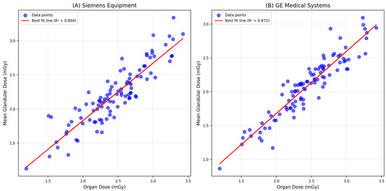 The comparative analysis of the calculated mean glandular dose (MGD) versus the system-reported organ dose (OD) for Siemens and GE Medical Systems equipment revealed different patterns in dose measurements, as illustrated in