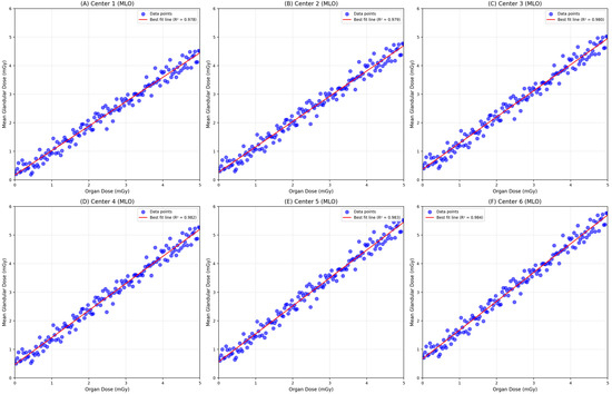 Figure 1 indicates that a lower dose of calculated MDGs was identified at a higher OD for both MLO and CC views of digital mammography for overall samples. When the correlation between the calculated MDGs and the system-reported ODs was analyzed across the six centers, it consistently showed that a lower value of MDG was identified at a higher OD for the MLO view in each center; however, based on the best-fit line, the strength of the correlation differs across the centers.