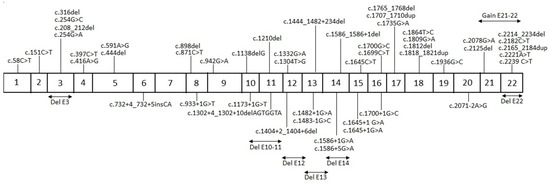 Schematic representation of the different pathogenic variants identified in PHEX. The above diagram depicts the variants lying on exons and resulting from duplications. The below diagram depicts the variants lying on intronic regions and resulting from deletions.