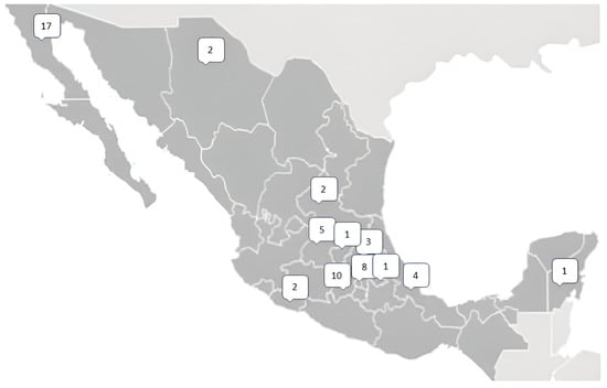 Map showing the distribution of the unique mutations over Mexico. Numbers represent the number of cases in each state. A plain map has been obtained from the publisher under the license commons: GNU Free Documentation License, version 1.2.