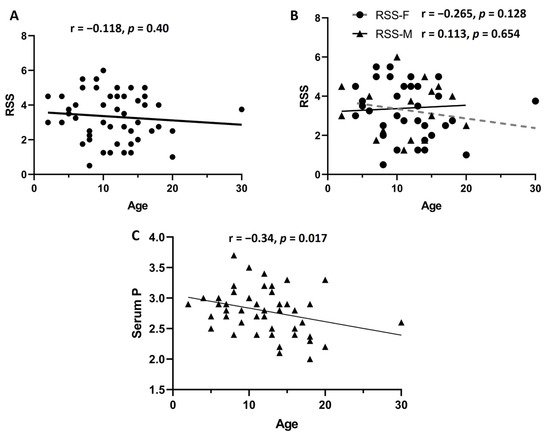 Correlation analysis. First, we analyzed the correlation between rickets severity score (RSS) in the 52 patients, and no significant correlation was observed (A). Afterwards, considering that males can have a more accelerated progression of the disease, we divided the group by sex (B). No significant correlation was observed in females (n = 34) or males (n = 18). When we performed correlation analysis between age and serum levels of phosphorus, a significant negative correlation was observed (C). Age is expressed in years.