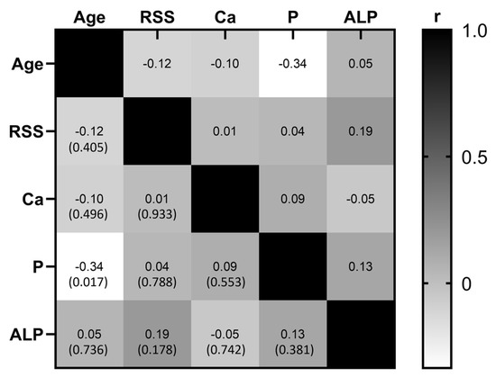 Correlation matrix. Correlation analysis was performed considering the age at diagnosis, rickets severity score (RSS), serum levels of calcium (Ca), phosphorus (P), and alkaline phosphatase (ALP). Grayscale represent the value of the correlation coefficient (r); positive correlations move towards the black color, while negative correlations move towards the white color, and the value of p is in parenthesis. The only significant correlation was observed between age and serum levels of phosphorus.