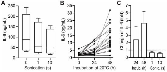 Alteration of plasma IL-6 levels by cell lysis and pre-centrifugation delay. Heparin blood from critically ill patients (N = 6) exhibiting increased levels of IL-6 (>7 pg/mL) was facultatively subjected to cell lysis by ultrasound treatment (sonication) for the times indicated ((A,C) rightmost two columns). Heparin blood from healthy people (N = 21) exhibiting normal levels of IL-6 (≤7 pg/mL) was facultatively subjected to incubation at 20 °C for the times indicated ((B,C) leftmost two columns). After pre-treatment, samples were centrifuged (4000× g, 10 min), and IL-6 was measured in the supernatant. Data in (A,B): median (line), interquartile range (box), and maximal range (error bars). Columns labeled “0”: results obtained without pre-treatment.