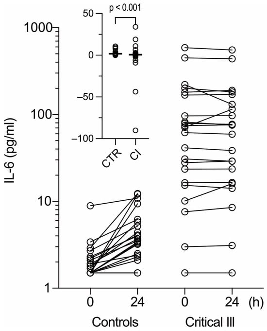 Given the responsiveness of IL-6 production in heparin blood to exogenous LPS, we considered that the pro-inflammatory stimuli present in the blood samples of critically ill patients could possibly be detected via increases in IL-6 following preincubation before centrifugation. However, contrary to expectations, preincubation for 24 of the heparin blood samples from critically ill patients induced lesser increases in, or even decreases in, IL-6 (Figure 2, left). The difference in IL-6’s response to the pre-centrifugation delay between the controls and the critically ill patients was significant in absolute terms (Figure 2, insert) and possibly reflects T-cell dysfunction [,]. However, critically ill patients with and without septicemia could not be discriminated between in this way (Figure S2), and a lack of increase in IL-6 upon the preincubation of heparin blood was not correlated with diminished leukocyte counts and/or a lowered lymphocyte fraction.