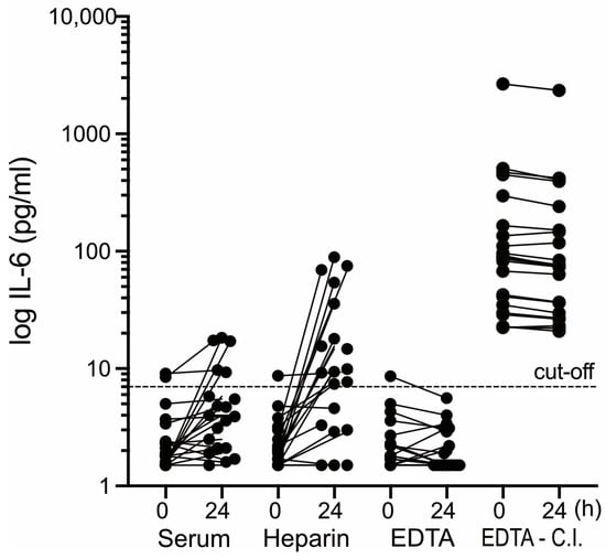 Increases in circulating interleukin-6 (IL-6) and its soluble receptor indicate the transition from acute to chronic inflammation []. The determination of IL-6 in human plasma or serum has been a long-standing tool in the diagnosis of chronic inflammatory diseases such as rheumatoid arthritis []. By now, it also plays a role in the clinical management of various other etiologies, including cancer [], cardiovascular disease and atherosclerosis [], COVID-19 progression [,], and post-acute COVID-19 vaccination syndrome []. In these and other inflammatory diseases, the sensitivity, specificity, and diagnostic value of IL-6 are considered superior to more conventional inflammation markers, such as C-reactive protein or other acute-phase proteins. The growing demand for IL-6 determination in routine health care has prompted the development of new assays suitable for point-of-care testing and high-throughput measurements [,]. Despite the widespread implementation of IL-6 measurements in medical laboratories, pre-analytic interferences and disturbances of IL-6 measurements are poorly defined.