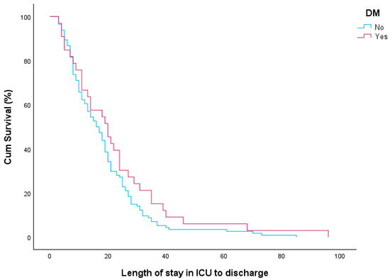 As far as the effect of DM on ICU length of stay from admission to discharge, in our study, a survival analysis was performed using the log-rank test. The median time to ICU discharge was 20 days for patients with DM and 16 days for those without DM. However, this difference was not statistically significant (Log-rank test p = 0.149). The Kaplan–Meier curves presented in Figure 1 illustrate the ICU length of stay until discharge for patients with and without DM. Similarly, in the Cox proportional hazards model, DM was not found to be associated with an increased risk of prolonged ICU stay from admission to discharge. The hazard ratio for ICU discharge in patients with DM compared to those without was 0.755 (95% CI: 0.509–1.121, p = 0.163).