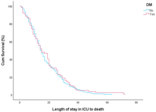 ICU length of stay until death for patients with and without DM.