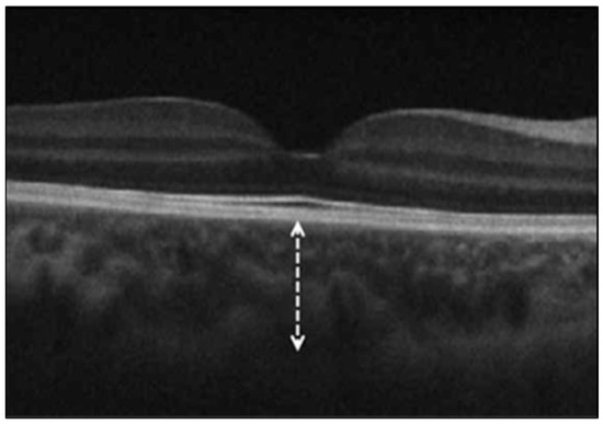 Spectral-domain optical coherence tomography image showing the subfoveal choroidal thickness, measured as the vertical distance (dashed arrow) from the outer border of the retinal pigment epithelium to the inner scleral border (sclerochoroidal interface) beneath the fovea.
