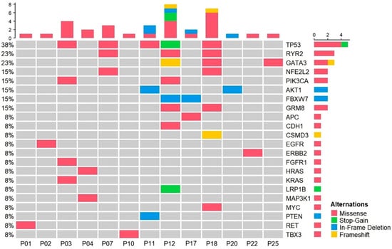The mutation profiles of the 13 ctDNA-detected cases varied from one to multiple somatic mutations per patient (Figure 1). Of the genes in which mutations were detected, mutations in TP53, RYR2, and GATA3 were the most frequent, whereas mutations in ERBB2, EGFR, KRAS, HRAS, and PTEN were each observed once in individual patients.