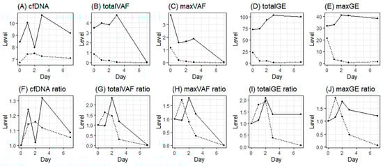 Daily ctDNA levels from the start of radiotherapy; (A–E), absolute mean values of cfDNA, total VAF, max VAF, total GE, and max GE; (F–J), relative mean values (ratio) from the baseline of cfDNA, total VAF, max VAF, total GE, and max GE (solid line, NED; dotted line, PD).