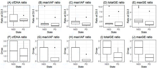 Dmax in groups with no evidence of disease (NED) or progression (PD); (A–E), maximum ratio during D2–3 of cfDNA, total VAF, max VAF, total GE, and max GE; (F–J), the day with maximum ratio (Dmax) of cfDNA, total VAF, max VAF, total GE, and max GE.
