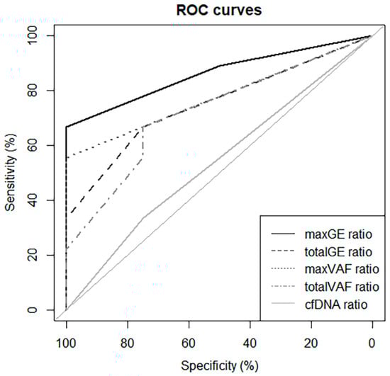 In our previous study, we used variant allele frequency (VAF, %) as a fundamental measure for quantifying ctDNA levels. In addition, genome equivalents (GE, hGE/mL) per plasma mL were calculated based on the product of the mean VAF and the plasma cfDNA concentration in each subject, divided by 0.0033 ng, which represents the estimated weight of a haploid human genome [15,16]. To identify a feasible index associated with progression, comprehensive variables quantifying various types of ctDNA, including sum of VAF from all detected variants (total VAF), maximum value of VAF in detected variants (max VAF), sum of GE (total GE), and maximum value of GE (max GE), were used as statistics. Also, the ratio of each measurement was defined as the value on a specific day divided by the value at D0.