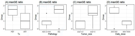 Next, we performed t-tests for subgroup analysis. Of the characteristics and Dmax, only Dmax was found to be related to PD (p = 0.015). However, a tumor size ≥ 3 cm, squamous histology, and a daily dose of 300–400 cGy were correlated to the Dmax of maxGE (p = 0.031, 0.031, and 0.031, respectively) (Figure 5).