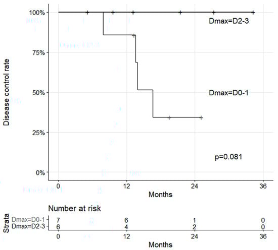 The results of survival analysis indicated that none of the characteristics were significant. Despite this, Dmax showed different disease control rates with marginal significance (p = 0.081, Figure 6).