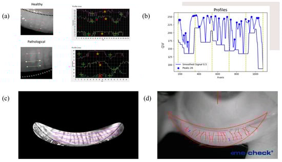 Pixel brightness, or gray value, reflects a tissue’s response to light and varies based on the imaging technology used, such as X-ray absorption in computed tomography scans or magnetic properties in magnetic resonance imaging [8,9]. Recent advances in radiomics, which examine pixel intensity and spatial relationships, have shifted focus from broad imaging to key regions of interest, enabling more precise, evidence-based analyses of pathological tissues [10,11]. For instance, radiodensity measures in skeletal muscle have been linked to predicting sarcopenic degeneration and cardiovascular diseases [12,13,14]. In meibography, infrared imaging captures the thermal responses of meibomian glands, requiring precise differentiation between glands and the surrounding tarsus. However, due to tissue overlap and light exposure, this distinction can be challenging. To overcome this limitation, a local approach is proposed. To recognize glands, the alternation between brighter spots (actual glands) and darker one (tarsus, background) is exploited: following a curved line from the left to the right side of the eyelid, a gray value swing may be observed, where the peaks match with glands and the valleys match with the background.