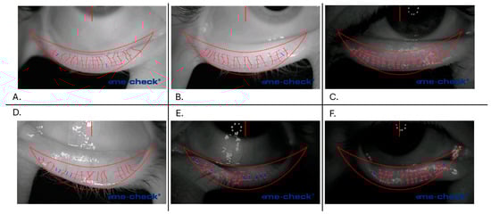 The number of glands is a patient-specific parameter. An example of algorithm output can be found in Figure 2, as well as in the Supplementary Materials (S2). Figure 2A–C show the algorithm’s ability to recognize glands in different bright environments, and the algorithm was able to identify most of the glands and their width. However, despite the algorithm having a built-in correction strategy to compensate for reflection spots, when this artifact was too heavy, the computation failed by missing glands and/or their length (Figure 2D,F). In addition, the output strongly depends on the quality of the eyelid eversion, such as prolapsed conjunctivae (Figure 2D) and incomplete eversion (Figure 2E,F), leading to missing glands and/or due to practitioner eversion expertise.
