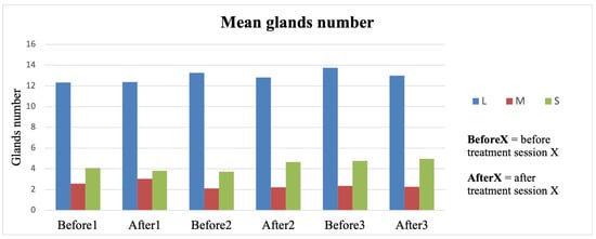 The same number of glands among the appointments should be counted to validate the algorithm; indeed, in Figure 3, the number of mean glands recognized in each visit shows almost no variation within the same gland group.