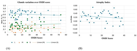 (A) The ratio of the number of long/medium/short glands over the total number per subject and their trends; (B) the atrophy index correlation with OSDI score.