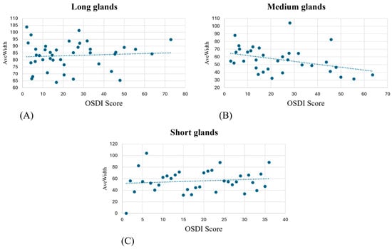 AveWidth showed no correlation with OSDI score when extracted from long glands (Figure 5A) but showed a progressive decrease for the medium gland (Figure 5B) and an increase for short glands (Figure 5C).