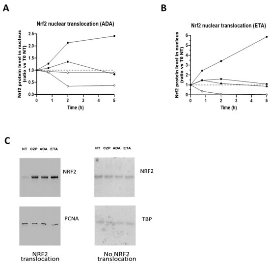 Variability of induction of Nrf2 nuclear translocation by TNFi in HD. Representative patterns are described here. Blood CD14+ monocytes purified from 4 different HDs were differentiated over 5 days into macrophages in the presence of recombinant GM-CSF and then stimulated with 10 µg/mL of TNF blockers: adalimumab (A) or etanercept (B). After 0.75, 2 or 5 h of stimulation, cells were harvested for cell fractionation. Nuclear translocation of Nrf2 was analyzed by Western blot and normalized on PCNA (Proliferating cell nuclear agent) or TBP (TATA-Box Binding Protein) expression. (C) Representative Western blots of Nrf2 nuclear translocation, or absence thereof, after a 5 h stimulation with CZP, ADA, or ETA.