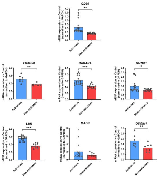 We then assessed the induction of an anti-inflammatory response upon ADA treatment, in the context of Nrf2 nuclear translocation. The rationale of the test on healthy donors was to set up methods to amplify genes of CD36 and the Nrf2 pathway and to define activators and non-activators of the pathways. To determine the stimulation time to have an optimal gene expression, we referred to our previous study on human monocytes []. We showed that RS activation by Fab TNFi induced scavenger receptor CD36 and the Nrf2-target gene HMOX1 expression. We then stimulated macrophages from HD using antibody TNFi (ADA) and analyzed CD36 and HMOX1 expression by RT-qPCR. According to our experience using CZP [] and preliminary experiments, we noted a peak of gene expression after 16 h of stimulation. To go further, we analyzed the transcriptional activity of Nrf2 target genes activated by RS. We studied the modulation of fifteen Nrf2 target genes described in reference [] by RT-qPCR in macrophages of HDs after TNFi stimulation, and selected six of them. Thus, in addition to CD36, we selected the following Nrf2 target genes (FBX030, GABARA, HMOX1, LBR, MAFG, OSGIN1), which play a role in the anti-oxidative stress response or anti-inflammatory pathway and were in our hands preferentially modulated upon TNFi stimulation. We observed two different subsets of healthy donors: donors in which TNFi stimulation increased mRNA of these target genes in macrophages (Figure 2, blue bars), and conversely, donors with no significant upregulation in transcription of these target genes (Figure 2, red bars). Based on these observations, we classified donors into two different categories: “activators” or “non-activators” of tmTNF-induced Nrf2 signaling upon antibody TNFi stimulation. However, some of the genes were not amplified (>40 cycles) in some donors, hence the discrepancies in the number of genes between donors.