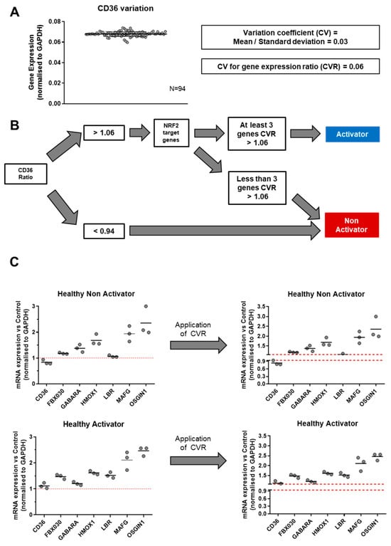 Identification of experimental variation of mRNA measurement and algorithm for the definition of tmTNF reverse signaling activator/non-activator status. (A) Coefficient of variation (CV) of qPCR experiments was measured by repeating the quantification of cd36 of one sample. mRNA expression was analyzed by technical duplicate and repeated 94 times. Coefficient of variation was calculated by dividing the 94 samples’ mean by their standard deviation. (B) Algorithm for the definition of tm TNF Reverse signaling activator status. First of all, CD36 mRNA ratio expression (Treated/Untreated) was analyzed and after application of CVR. If this ratio was less than 0.94, individual was classified as non-activator. If CD36 ratio was greater than 1.06, an analysis of Nrf2 target genes was necessary. If at least 50% of Nrf2 target gene ratios are greater than 1.06, then individual was classified as activator. Otherwise, individual was classified as non-activator. (C) Example of algorithm application. Analysis of RT-qPCR replicate variability and its impact on tmTNF Reverse signaling status classification. Three replicates of RT-qPCR were performed with 1 or 2 days of interval for a healthy non-activator donor and a healthy activator donor. Application of CVR is represented by a scale cut between 0.94 and 1.06 on y axis. Red dot line corresponds the the limit of significant change according to the coefficient of variation of the test. Data are presented as mean of mRNA fold change vs. unstimulated control condition normalized to gapdh. (n = 3).
