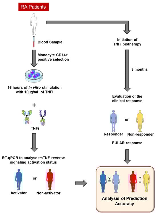 Experimental protocol to predict TNFi clinical response depending on tmTNF reverse signaling activator status. Active RA patients’ blood was collected before initiation of TNFi therapy. CD14+ monocytes were purified prior to being stimulated or not with different TNF blocker (adalimumab for the mAbs class, etanercept for the soluble receptor class) for 16 h. Cells were harvested and cd36, fbx030, gabara, hmox-1, lbr, mafg and osgin1 mRNA expression analyzed by RT-qPCR. Depending on RT-qPCR results, patients are classified as Activators or Non-activators as a predictive marker of later clinical response. Clinical response was assessed at month 3 according to EULAR response criteria.