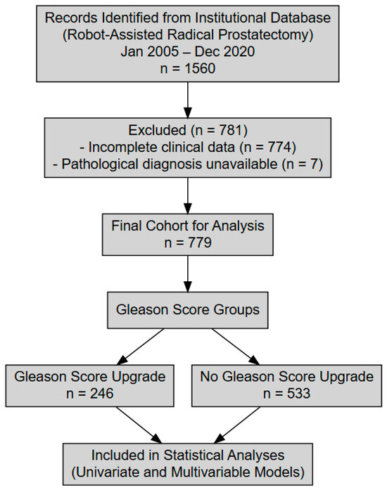 The primary objective of this research was to identify factors that may predict Gleason score upgrading (GSU) following RARP. To achieve this, this study employed both univariate and multivariable logistic regression analyses to explore relationships between various clinical and pathological characteristics and the likelihood of Gleason score changes. All patient records underwent thorough review and data cleaning to maintain accuracy, with any incomplete cases being systematically excluded.