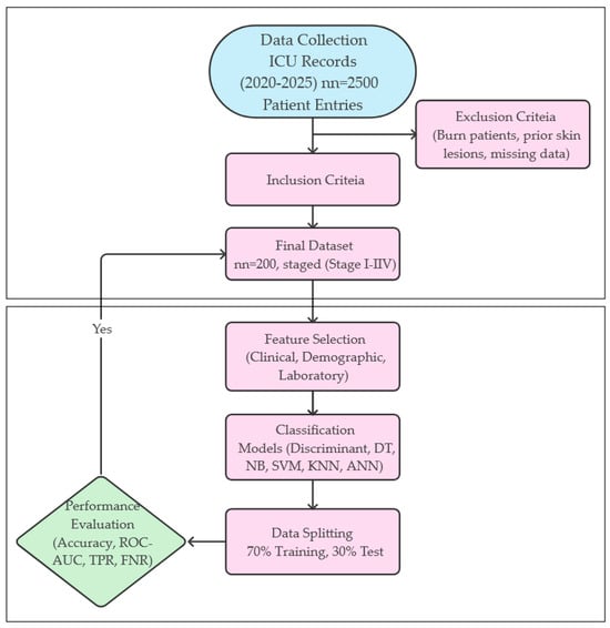 In this study, the classification process was performed using comprehensive clinical, demographic and laboratory data from patients hospitalized in the intensive care unit. The aim was to accurately predict the pressure ulcer stages (Stage I–IV) of the patients using this multidimensional dataset. No feature selection was applied in the study; instead, all available variables were directly included in the classification models. This approach ensures that the model utilizes all possible sources of information, while avoiding the exclusion of variables that are potentially important for decision support systems, especially in clinical applications.