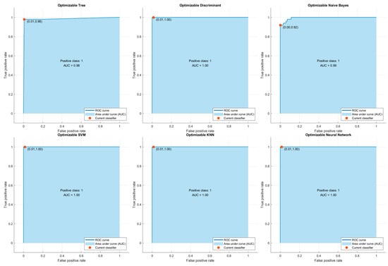 According to the results obtained in this context, Optimizable Discriminant, SVM, KNN and ANN models exhibited excellent discrimination with AUC = 1.00. This shows that these models can classify the pressure ulcer stages accurately. The Optimizable Naive Bayes model performed very well, with AUC = 0.99. The Optimizable Tree model, which performed relatively poorly, still showed an acceptably strong discriminative ability with an AUC = 0.98.