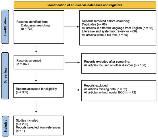 We identified 731 articles through database search. Duplicates were omitted and 428 records were excluded (Table S1) because they did not meet the inclusion criteria as mentioned above. A total of 236 articles were considered in our study (235 papers matched our criteria, while one was added after screening references of all selected studies) [7,8,9,10,11,12,13,14,15,16,17,18,19,20,21,22,23,24,25,26,27,28,29,30,31,32,33,34,35,36,37,38,39,40,41,42,43,44,45,46,47,48,49,50,51,52,53,54,55,56,57,58,59,60,61,62,63,64,65,66,67,68,69,70,71,72,73,74,75,76,77,78,79,80,81,82,83,84,85,86,87,88,89,90,91,92,93,94,95,96,97,98,99,100,101,102,103,104,105,106,107,108,109,110,111,112,113,114,115,116,117,118,119,120,121,122,123,124,125,126,127,128,129,130,131,132,133,134,135,136,137,138,139,140,141,142,143,144,145,146,147,148,149,150,151,152,153,154,155,156,157,158,159,160,161,162,163,164,165,166,167,168,169,170,171,172,173,174,175,176,177,178,179,180,181,182,183,184,185,186,187,188,189,190,191,192,193,194,195,196,197,198,199,200,201,202,203,204,205,206,207,208,209,210,211,212,213,214,215,216,217,218,219,220,221,222,223,224,225,226,227,228,229,230,231,232,233,234,235,236,237,238,239,240,241,242]. All data collected are reported in a dataset (Table 1), while the characteristics of the studies are summarized in Table 2. The articles selected were mainly retrospective (32.6%), case series (32.6%), and reports (22.8%). Most of the articles included were described by ophthalmologists (67.5%), dermatologists (11.2%), and plastic surgeons (5.6%) but also less frequently by other specialists. A total of 71.730 patients with ocular and periocular BCCs are included in the present systematic review with meta-analysis and their characteristics are described in Table 3. Different anatomical locations are summarized in Table 4. “Eyelid and periocular area” (48.7%) and “eyelid” (29.9%) were the two more commonly involved sites, while “periocular”, “ocular”, and “caruncle” areas were only rarely interested. Clinic, dermoscopy, RCM, and histopathology data are included in Table 5, while treatments are given in Table 6.
