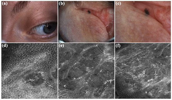 In September 2022, a 38-year-old lady was referred to San Gallicano Dermatological Institute-IRCCS, for evaluation of a caruncle pigmented lesion on the left eye. Her family and medical history were unremarkable. The lesion, which appeared approximately 7 months ago, was indolent. Clinical examination revealed a millimetric flat lesion, with faded and irregular margins, black-blue in color (Figure 2a). After applying oil immersion fluid, dermoscopic examination with VivaCam® showed the presence of blue–black structureless areas (Figure 2b,c). Sharply demarcated lobular nests, outlined by dark peritumoral clefting, were detected with the RCM handheld probe and corresponded to basaloid islands (Figure 2). Polarized elongated keratinocytes (streaming) characterized the overlying skin (Figure 2d). Hyper-refractile thin dendrites and bright oval structures were observed within and around the tumor island (Figure 2e,f), corresponding to melanophages, while peripheral palisading of nuclei can also be detected at higher magnification. The adjacent dermal stroma contained small bright dots compatible with smaller inflammatory cells. Convoluted and dilated blood vessels coursing in the horizontal plane of imaging were seen in real-time or video-mode RCM imaging, juxtaposed to the tumor islands (Video S1). Based on RCM findings, a diagnosis of pigmented BCC was made, and the lesion was subsequently surgically removed by an ophthalmologist. Histopathologic examination confirmed the diagnostic suspicion and the tumor was completely excised with a 2 mm of free margins. The patient did not complain of any discomfort or functional impairment. At a two-year follow-up, no signs of local recurrence were observed.