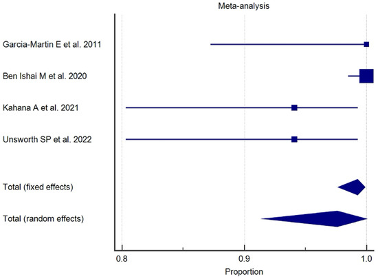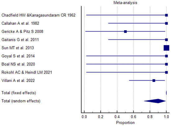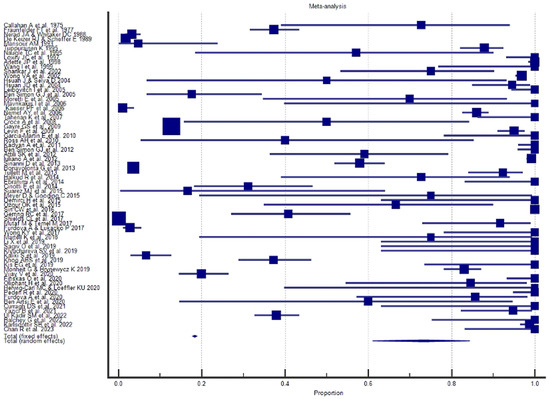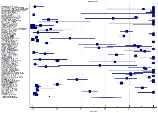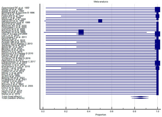 The results of the proportional meta-analysis, including the combined proportion (95% CI), are summarized in Table 7, with estimates of the overall proportion shown in the Forest Plot (Figure 3, Figure 4, Figure 5, Figure 6, Figure 7 and Figure 8). The overall proportion for “clinical trial” was 97.6% (91.6–99.9), demonstrating significant and extreme heterogeneity (Q = 122.7, df = 3, I2 = 75.6%, p = 0.006). For “prospective study” and “prospective case series”, the overall proportion was 93.0% (79.2–99.6), indicating significant and extreme heterogeneity (Q = 40.6, df = 20, I2 = 99.5%, p < 0.001). “Retrospective study” showed an overall proportion of 61.1% (48.8–72.8), with significant and extreme heterogeneity (Q = 346.3, df = 75, I2 = 99.8%, p < 0.001). “Case reports” and “case report with review of the literature” studies showed an overall proportion of 85.3% (77.7–91.0), with non-significant and homogeneous (Q = 77.8, df = 53, I2 = 0.0%, p = 1.000). “Case series” studies showed an overall proportion of 73.3% (62.1–83.3), with significant and extreme heterogeneity (Q = 199.1, df = 66, I2 = 99.6%, p < 0.001) and “letter” showed an overall proportion of 89.9% (72.8 to 99.0), with significant and moderate heterogeneity (Q = 233.3, df = 8, I2 = 65.7%, p = 0.003).