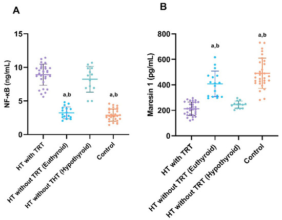 Graphical representation of serum NF-kB (A) and Maresin 1 levels (B) in the TRT-treated, non-treated, and control groups. a p < 0.001 vs. hypothyroid HT group; b p < 0.001 vs. HT plus THT group.