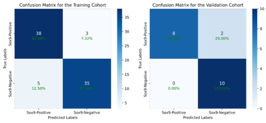 Finally, patients were randomly assigned to either the training cohort or the validation cohort using the classic hold-out strategy [26], with 20 patients in total allocated for validation. This group included 10 (50%) from the SOX9-positive group and 10 (50%) from the SOX9-negative group. The training cohort consisted of 72 males and 9 females, with a median age of 52 years (IQR: 43–61). In contrast, the validation cohort included 18 males and 2 females, with a median age of 49 years (IQR: 40–60). No significant differences were observed between the training and validation cohorts in terms of sex or age distribution. A summary of the cohorts’ characteristics is presented in Table 1. The data interpreted include PLTs (Platelets), Neutrophils, Lymphocytes, TBIL (Total Bilirubin), ALT (Alanine Aminotransferase), AST (Aspartate Aminotransferase), ALB (Albumin), GGT (-glutamyl transpeptidase), AFP (Alpha-Fetoprotein), and CEA (Carcinoembryonic Antigen).