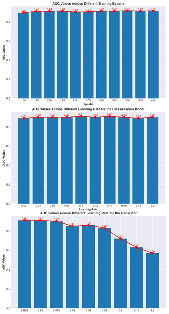 Figure 6 shows the impact of different training parameters on model performance. It can be observed that the number of training epochs and the initial learning rate of the classification model have minimal impact on the model’s results, indicating that our model is highly robust and can achieve an optimal performance across various parameter settings. However, the initial learning rate of the reinforcement learning has a significant effect, especially when the initial value is large.