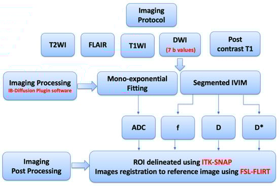 MRI brain examinations were performed using a 1.5-Tesla GE MRI scanner with a magnetic gradient strength of 45 mT/m (GE Healthcare, Waukesha, WI, USA) and Syngovia software version LX 27 (Siemens Healthineers, Erlangen, Germany), multichannel phased-array head coil equipped with eight channels. All patients with MS underwent standard imaging protocols for MS, which included the following imaging sequences: three-dimensional (3D) T1, 3D fluid-attenuated inversion recovery (FLAIR), two-dimensional (2D) T2WI, and 2D diffusion-weighted imaging (DWI), in addition to 2D and 3D post-contrast T1WI imaging. Three-dimensional pre- and post-contrast T1WI images were acquired using the Fast Spoiled Gradient “FSPGR” sequence with the following parameters: repetition time (TR) = 9 ms, echo time (TE) = 4 ms, and an acquired resolution of 1.8 × 0.5 × 0.5 mm. Three-dimensional FLAIR images were obtained using the Fast Spin Echo “FSE” sequence with the following parameters: TR = 6900 ms, TE = 94 ms, and an acquired resolution of 0.9 × 0.5 × 0.5 mm. Two-dimensional axial T2WI images were acquired using the Blade FSE sequence with the following parameters: TR = 7807 ms and TE = 123 ms. The 2D post-contrast T1WI images were acquired using the Spin Echo “SE” sequence with the following parameters: TR = 517 ms and TE = 9 ms. Both 2D T2WI and 2D post-contrast T1WI were acquired with the same resolution of 0.4 × 0.4 × 4.5 mm. Additionally, DWI images were acquired using the single-shot echo-planar imaging technique for patients with MS as well as control participants. The acquisition settings included TR = 4508 ms, TE = 77.5 ms, and an acquired resolution of 0.8 × 0.8 × 5 mm. Seven b-values (0, 30, 50, 70, 100, 200, 500, and 1000 s/mm2) were used in three orthogonal directions to generate a mono-exponential apparent diffusion coefficient (ADC) map and to produce D, D*, and f maps using the segmented IVIM mode. Two-dimensional conventional T2 WI, post-contrast T1WI, and DWI sequences were acquired with the same slice location. Figure 2 presents a flowchart of the imaging protocol and processing steps.