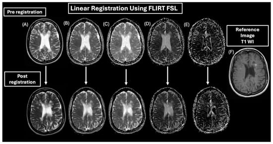 Pre- and post-linear registration of the IVIM parametric maps of a MS patient. (A) T2 WI, (B) ADC map, (C) diffusion coefficient (D) map, (D) pseudo-diffusion coefficient (D*) map, and (E) perfusion fraction (f) map to the T1WI as a reference image (F).