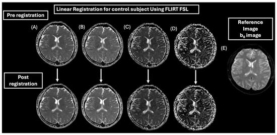 Pre- and post-linear registration of the IVIM parametric maps of a control subject. (A) ADC map, (B) diffusion coefficient (D) map, (C) pseudo-diffusion coefficient (D*) map, and (D) perfusion fraction (f) map to the b0 as a reference image (E).