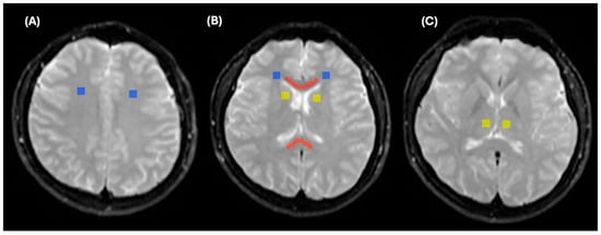 Regions of interest (ROIs) for control participants were delineated using b0 images with the ITK-SNAP program [39]. Four ROIs were outlined for control participants, including the genu of the corpus callosum (GCC) and the splenium of the corpus callosum (SCC), both marked in red; the white matter, marked in blue; and the deep white matter, marked in yellow, as shown in Figure 5. Measurements from the GCC and SCC were averaged and collectively referred to as the corpus callosum (CC). Similarly, measurements from the right and left frontal white matter areas, as well as the right and left frontoparietal white matter at the convexity, were averaged and collectively referred to as the WM. Measurements from the right and left thalamus and the right and left caudate nuclei were averaged and collectively referred to as the deep white matter. The size of CC ROIs was maintained at 600 ± 50 mm2, while the sizes of the white matter and deep white matter ROIs were maintained at 284 ± 5 mm2.